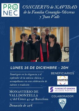 ¡Vuelve el clásico de Pronec! Concierto Solidario de Navidad con la familia Conangla-Oliveras y Joan Valls. La recaudación irá a la Fundación Sandra Salgado Montells y Xamfrà. ¡Te esperamos para compartir juntos una noche de música y solidaridad!
