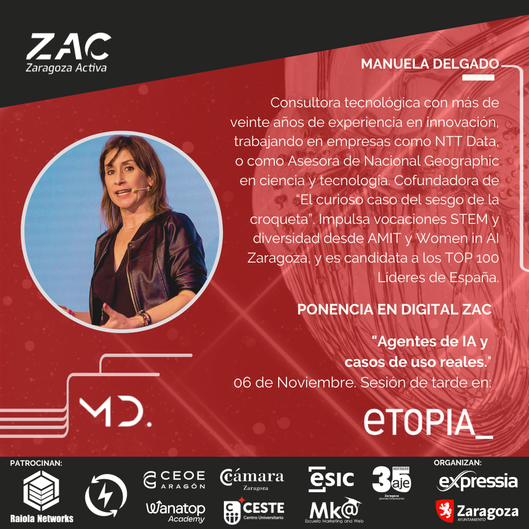 El primero de ellos lo impartirá, Manuela Delgado, Asesora de National Geographic en ciencia y tecnología, nos adentrará en el apasionante universo de los Agentes de IA y su aplicación práctica en distintos entornos profesionales. Con su experiencia en el ámbito de la inteligencia artificial, Manuela ofrecerá una visión clara y accesible sobre cómo estos agentes funcionan y qué posibilidades abren para optimizar procesos y generar valor real en las organizaciones.