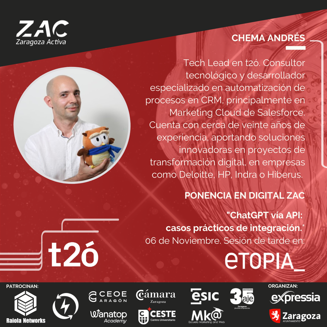 En el tercer workshop, Chema Andrés, Technical Lead en t2ó, presentará una introducción práctica a la integración de ChatGPT vía API, orientada a perfiles con conocimientos técnicos básicos en desarrollo e integraciones. La sesión tiene como propósito sentar las bases necesarias para comenzar a trabajar con la API de OpenAI.