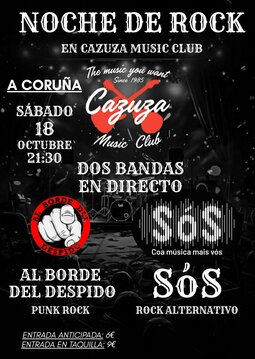 El 18 de octubre nos vemos en el Cazuza a las 21.30h para un concierto con dos bandas que vienen con todo: Al Borde Del Despido y SóS. Una noche para disfrutar, compra tu entrada ya!