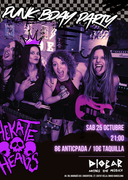 Este sábado, 25 de octubre, a partir de las 9 pm, recibiremos a Hekate Heads, cuarteto de punk rock que llega al Diobar con un repertorio que combina canciones originales con algunas versiones... Además de punkrockear con todo, celebraremos el cumpleños de Lou, la baterista del grupo, en una buena ocasión para compartir energía y buen rollo...