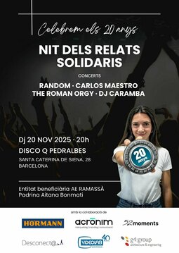 La Nit dels Relats Solidaris és un dels esdeveniment musicals i solidaris que any rere any s'ha consolidat com a data imprescindible dels concerts de Barcelona. Enguany ret homenatge als 20 anys de la iniciativa, una iniciativa única que ha convertit l'esport i la literatura en motor de canvi social.