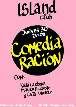 Presentado por Carla Mañas y Gonzaga de la Calle, COMEDIA RACIÓN, el jueves 30 a las 21:00 en el ISLAND CLUB tu sitio favorito. ¿Cuánto más os puede dar este evento? ¿Qué más queréis?