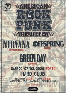 “American Rock Punk” é um festival onde poderás reviver as músicas das maiores bandas do punk-rock americano, na companhia das melhores bandas tributo: NIRVANA (Neverminders), GREEN DAY (Suburbia) e THE OFFSPRING (Smash).