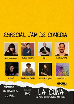 El próximo 7 de noviembre vuelve la comedia a la cuna de Elche con el especial Jam de comedia donde los cómicos y cómicas invitados probarán sus nuevas creaciones en nuestro laboratorio de comedia. los encargados del humor serán Noemí, Andrea Romero, Juli, La Marika de Pueblo, María Rodríguez, Sergio Navarro, Sean Durking y Paco Taco. Risas aseguradas!!!!