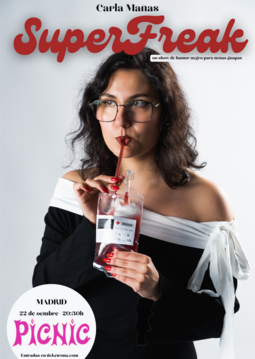 Carla Mañas presenta SUPERFREAK, un show de humor negro para nenas guapas. Pero puedes venir aunque no seas nada de eso. Cincuenta minutos de tiza chirriando en la pizarra, autismo grado 1 y ponerse el pelito detrás de la oreja como una jovencita de los años 40. La mezcla perfecta entre Sabrina Carpenter y Charles Manson.
