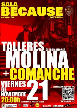 Con una marcada estética y sus monos azules de trabajo, suben al escenario para lanzar fogonazos de tres minutos llenos de adrenalina, ironía y mala leche, sin artificios ni solos instrumentales pretenciosos. Talleres Molina además son la primera banda que anunció su fecha de disolución como tal (el 27/11/2027), el mismo día en el que se presentaron en sociedad. Son jóvenes, son emergentes, ni cantan ni bailan...pero no se los pierdan, oiga...sus canciones son auténticos pepinos!.