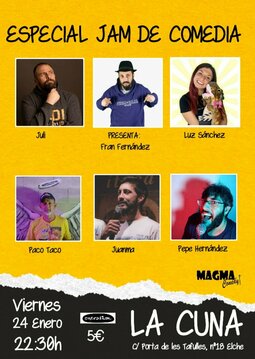 COMEDIA!!!! Vuelven los monólogos en formato "ESPECIAL JAM DE COMEDIA" donde Luz Sánchez, Juli, Juanma, Pepe Hernández y Paco Taco probarán en exclusiva sus nuevos monólogos en nuestro laboratorio de comedia y donde el público decidirá qué monólogos sobreviven y cuáles irán a la basura. Todo esto presentado por Fran Fernández.
