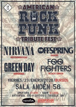 “American Rock Punk” regresa en su nueva temporada con el festival de tributos más rompedor, que ya ha petado las mejores salas de todo el país reviviendo los temazos de las grandes bandas del punk-rock americano, de la mano de sus mejores bandas tributo: NIRVANA (Neverminders), GREEN DAY (Suburbia), THE OFFSPRING (Smash) y FOO FIGHTERS (Black Limos).