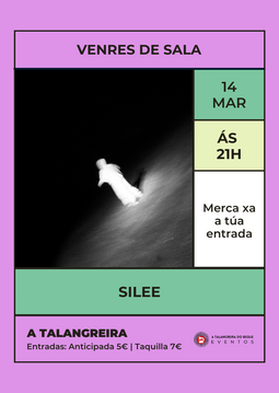 Este venres 14 de marzo ás 21:00 en A Talangreira, non podes perder o concerto de Silee, artista emerxente de O Morrazo que está a revolucionar a música urbana da comarca. Cun estilo propio e un coidado exquisito en cada detalle, tanto nas súas cancións como nos seus impecables videoclips, promete unha noite inesquecible.