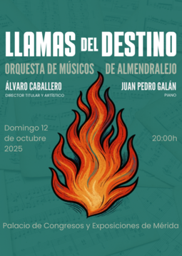 Llamas del Destino es el primer concierto sinfónico de la nueva temporada 25/26 «CRESCENDO» de la Orquesta de Músicos de Almendralejo. Con un programa de la más alta calidad que incluye obertura Egmont de Beethoven, concierto para piano y orquesta número 20 de Mozart, interpretado por Juan Pedro Galán; y las suites 1 y 2 de L´Arlésienne de Bizet. La OMA, dirigida desde su fundación por el joven Álvaro Caballero, es un proyecto dedicado a jóvenes músicos extremeños para promover la cultura musical en la región, especialmente dirigido a un público juvenil. Un concierto único, una experiencia inolvidable.