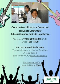 Concierto solidario del grupo Full Stop, cuyos beneficios irán a financiar el proyecto Anatha, que se lleva a cabo en Battambang, Camboya, por la organización de Mons. Kike Figaredo. Sauce ONG financia este proyecto desde España.