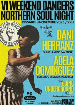 Torna el Weekend Dancers! El proper dissabte 8 de novembre es celebra la sisena nighter de Northern Soul a la Sala Club Paral·lel 62. Per aquesta ocasió, a més dels dj's residents Going Underground, comptarem amb la participació d'uns convidats d'alt nivell: Des de Astúries, Adela Domínguez! Poca presentació necessita, ja que s'ha passejat amb la seva maleta de discos per grans esdeveniments de soul, tant a nivell nacional com internacional (Someday Northern soul All-nighter, Fortyfive Degrees Soul Club, Bristol Internacional rare soul weekender...). I des de València, un veterà de l'escena i bregat als plats... Dani Herranz! A més d'organitzar la fantàstica All-nighter Shing-a-ling a la ciutat del Túria, és ben conegut pels magnífics sets que dispara, amb exquisits temes de northern i rare soul. Serà una nit dedicada a la pista de ball i a compartir un grapat de cançons meravelloses, d'aquelles que es queden guardades en l'ànima i marquen per sempre les nostres vides. La pista de fusta t'espera!