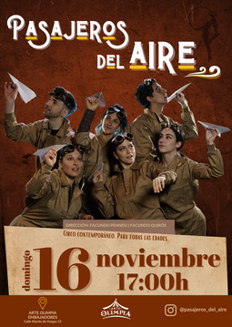 Seis viajeros se embarcan en una travesía por ocho mundos donde todo flota, gira y se transforma. A través de una fusión de danza, teatro físico y acrobacias aéreas y de suelo, cada desafío se convierte en aprendizaje: descubrir valores, tomar rumbos inesperados y levantarse después de cada tropiezo. Pasajeros del aire celebra el amor, la amistad y el respeto, e invita a niñas, niños y personas adultas a mirar su propio mundo con otros ojos. Una aventura visual y emotiva que recuerda que los sueños se alcanzan paso a paso, con coraje y en compañía.