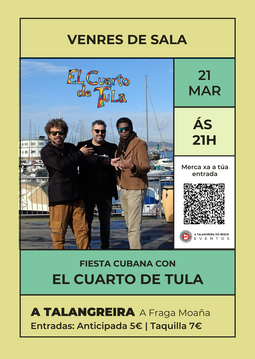 Este venres 21 de marzo ás 21:00 en A Talangreira, prepárate para un auténtico viaxe á Cuba máis profunda e tradicional da man de El Cuarto de Tula. A mellor música cubana de toda a provincia chega ata nós para facernos bailar e sentir o son máis auténtico da illa.