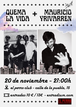 El próximo jueves 20 de noviembre a las 21:00 horas, la Sala El Perro de la Puerta de Atrás (Madrid) acogerá un concierto muy especial. Sobre el escenario estarán Quema la vida, banda que despliega toda la energía del mejor rock, y Mauricio Yrivarren, con un repertorio cargado de frescura y melodías pop que no dejarán indiferente a nadie. Dos propuestas complementarias, que prometen una noche llena de intensidad, ritmo y emoción. Una oportunidad única para descubrir en directo a dos artistas con gran proyección.