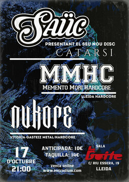 Concierto presentación del nuevo disco "Catarsi" de la banda de Hard Rock/Metal de Lleida "Saüc", acompañada por la banda de Hardcore de Lleida "Memento Mori" y por la banda de Metal/Hardcore de Vitoria-Gasteiz "Nukore".