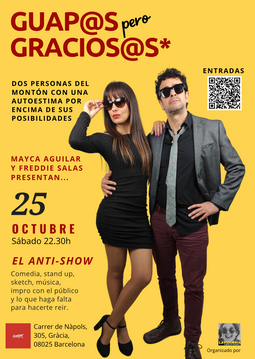 Guap@s pero Gracios@s es un show de comedia inclasificable (como sus protagonistas), donde Mayca Aguilar y Freddie Salas se lanzan sin vergüenza a mezclar stand-up, sketches, música en vivo, improvisación con el público y lo que haga falta para arrancarte carcajadas.